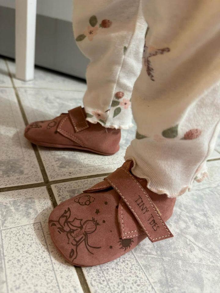 Pantofii Tiny Toes sunt fabricați manual în România, în serii mici și unicat, folosind tehnici artizanale care minimizează impactul negativ asupra mediului.