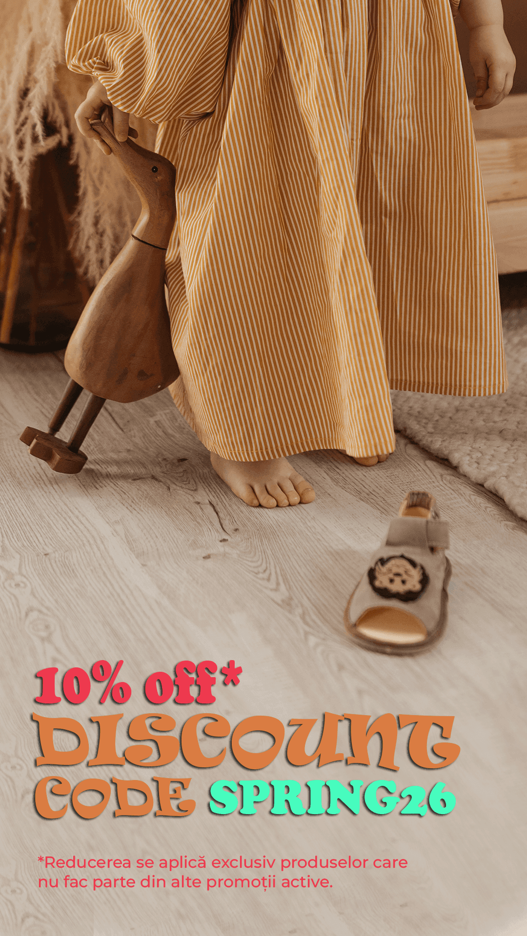 Primii pași spun o poveste care abia începe. De aceea, misiunea Tiny Toes este de a crea încălțăminte sănătoasă, realizată responsabil, pentru cei mici. Ne angajăm să susținem mișcarea naturală a copiilor, condiții de muncă etice în lanțul nostru de producție și utilizarea de materiale prietenoase cu mediul, contribuind astfel la bunăstarea copiilor și la un viitor mai blând cu planeta.